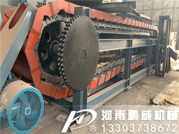 鏈板機(jī)結(jié)構(gòu)設(shè)計(jì)合理,使用性能好,運(yùn)行阻力小,易損零件少,操作安全,維修方便,運(yùn)行可靠,使用壽命長(zhǎng)。鏈板機(jī)可水平或傾角<30°安裝,傾斜安裝時(shí),配有棘輪逆止機(jī)構(gòu)。輸送鏈板上的輥輪在導(dǎo)軌上滾動(dòng),輸送鏈與機(jī)殼無(wú)磨擦;鏈條采用合金鋼熱處理加工制成,其正常使用壽命3年左右,運(yùn)行中故障率低。除頭尾軸承外,輸送機(jī)中無(wú)潤(rùn)滑點(diǎn)。鏈板機(jī)由頭部機(jī)架、頭部護(hù)罩、主動(dòng)鏈輪組、輸料裝置、中部機(jī)架、尾部機(jī)架、改向鏈輪組,鏈板托輪組和驅(qū)動(dòng)裝置組成。驅(qū)動(dòng)裝置由柱銷聯(lián)軸器、JZQ減速機(jī)、驅(qū)動(dòng)底座組成。分右裝和左裝兩種,從機(jī)尾向輸送方向看,驅(qū)動(dòng)裝置在右側(cè)為右裝,在左側(cè)為左裝。鏈輪采用組裝式結(jié)構(gòu),由鑄鋼鏈輪圈與鏈輪芯用螺栓聯(lián)結(jié)組合,耐磨性能強(qiáng),便于拆卸安裝。主動(dòng)鏈輪采用窩眼鏈輪圈,防止環(huán)鏈運(yùn)行中滑動(dòng)。